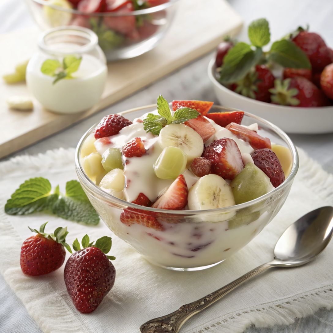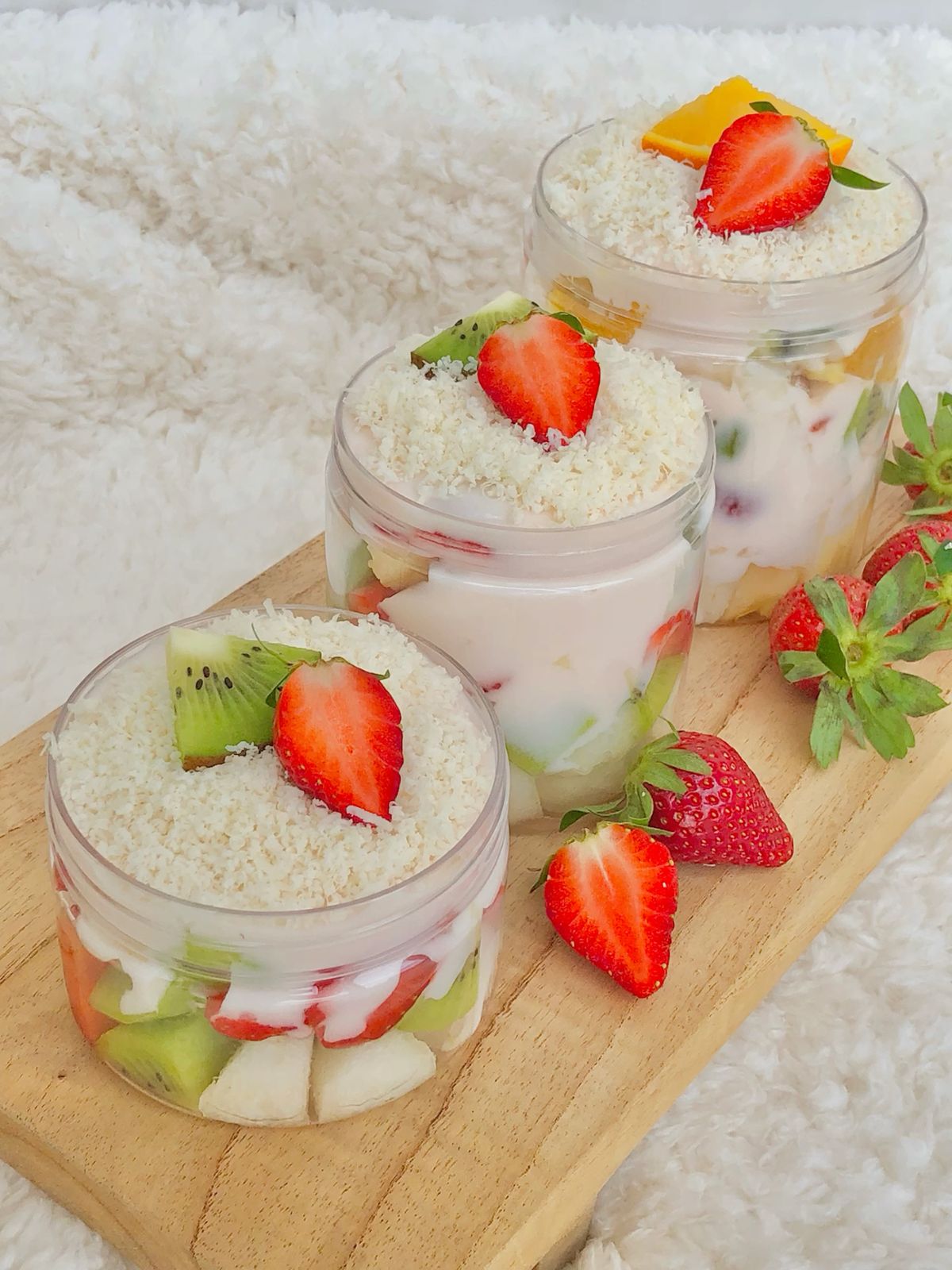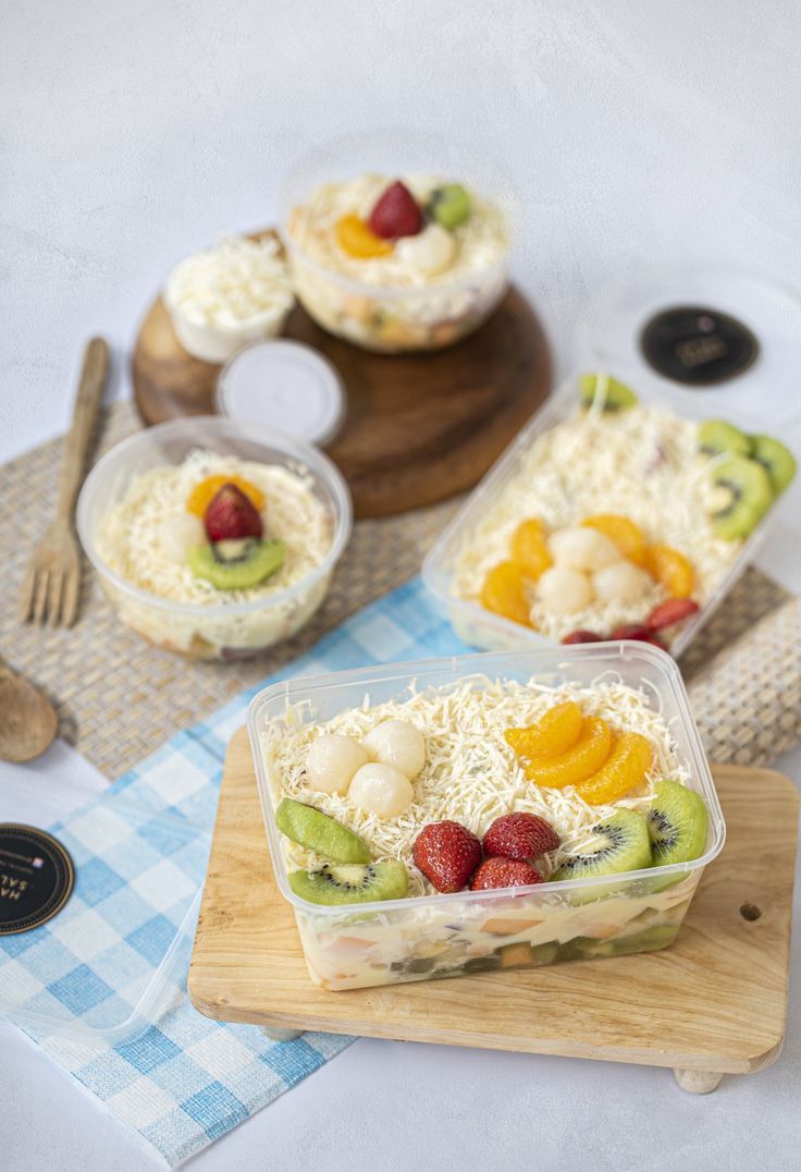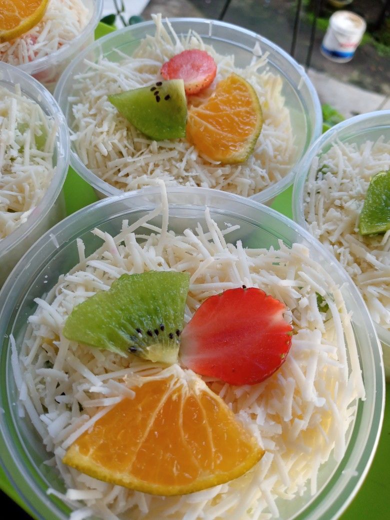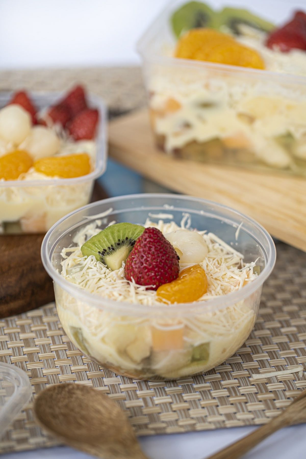 Salad buah segar dengan topping keju melimpah, perpaduan manisnya stroberi, kiwi, jeruk, dan leci yang memanjakan lidah. Cocok dinikmati kapan saja untuk camilan sehat dan menyegarkan.